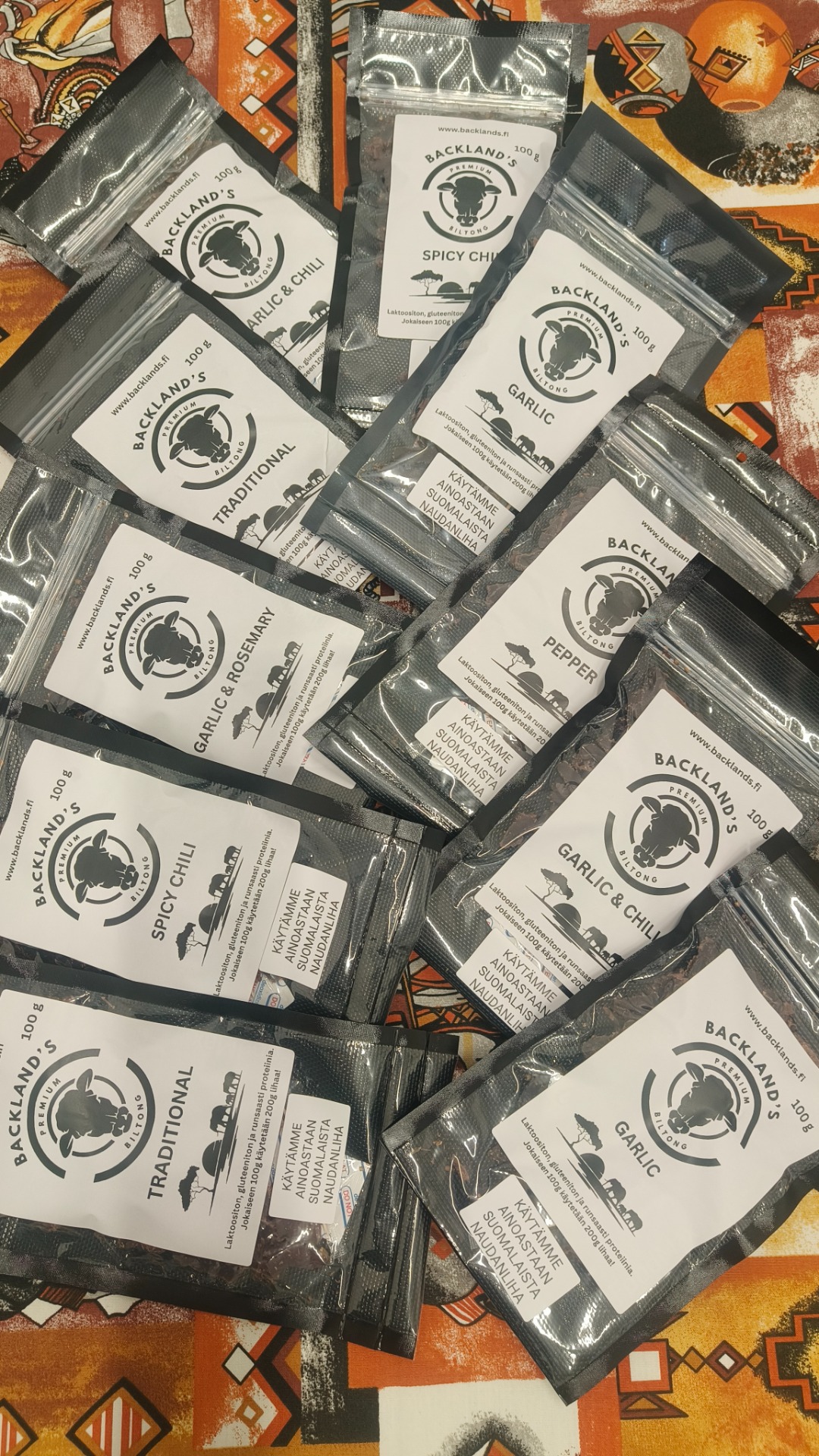 Tässä tarjous mikä et halua ohittaa! Kymmenen 100g pusseja herkullista biltongia! Jos olet itse täys 10 tai tunnet ihminen mikä on täys 10 niin tämä on oivallinen lahja. Muistaa laittaa viestikentään haluamaasi maut ja määrät. Voit antaa meidät myös valitse mikä laitetaan, silloin tulee kyllä kaikki kuutta eri makua.